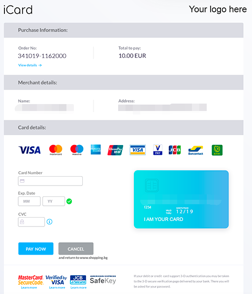 目前,icard direct已集成并接受万事达卡,visa,美国运通,jcb,银联,bancontact和borica的付款。提供多种货币处理和结算服务,以欧元,英镑,瑞郎,捷克克朗,ron,bgn,jpy,pln,isk,try付款。
