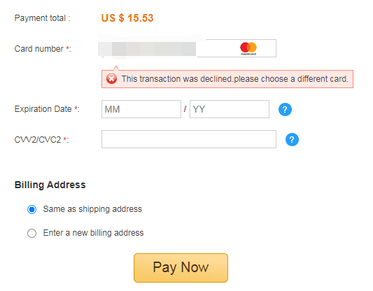 显示 this transaction was declined. please choose a different card. (此交易被拒绝,请选择其他卡。)