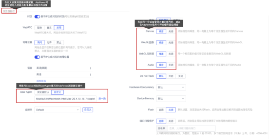 在adspower浏览器中,可以自定义修改浏览器的useragent信息: