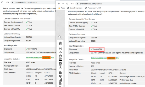 我们看到不同浏览器环境的canvas指纹是不一样的,这样网站就无法识别两个账号是在同一台电脑上登录了。(检测网站:https://browserleaks.com/canvas)