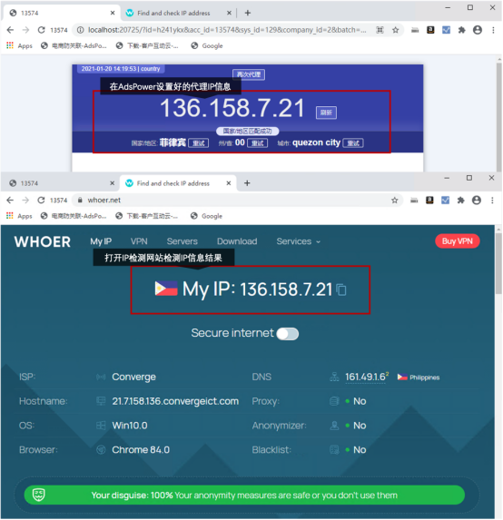 我们在设置adspower浏览器的指纹干扰后,使用检测工具进行检测的信息如下: