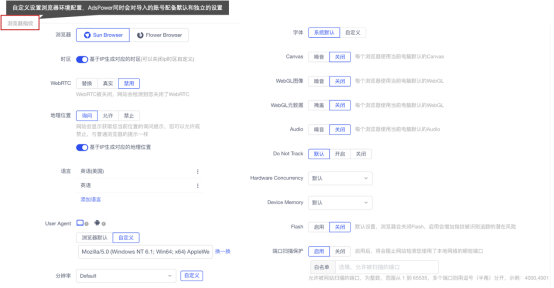 adspower指纹浏览器基于chromium,除了设置代理ip,还可以修改基础的指纹信息ua、时区、语言、geo、分辨率、字体等等。