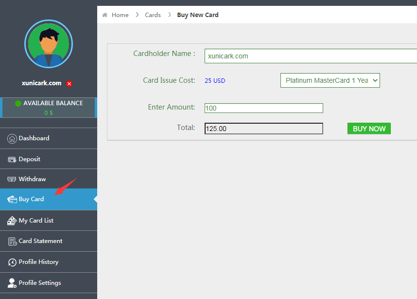 进入账户中心点击buy card购买虚拟卡